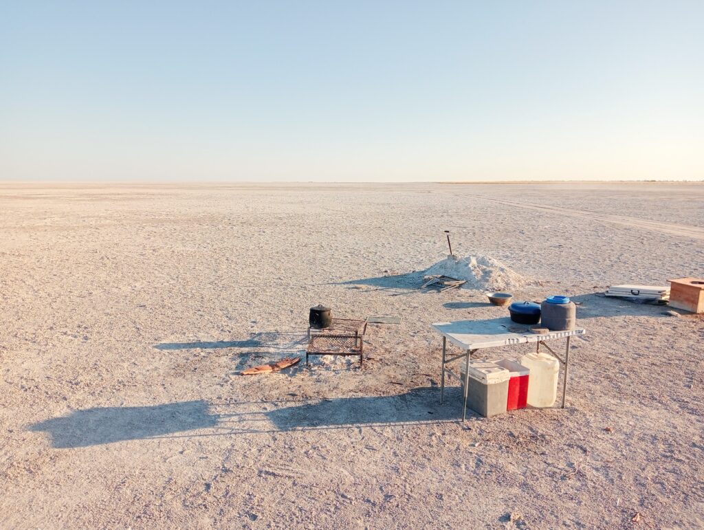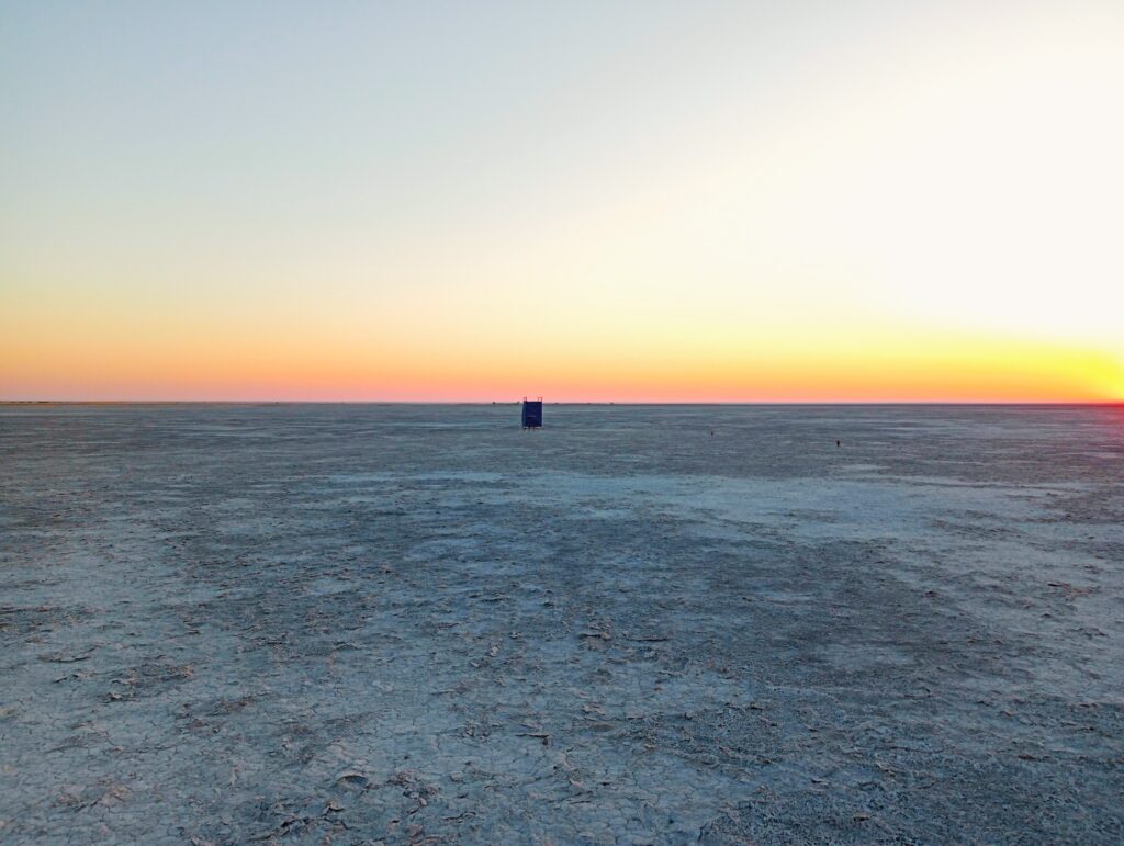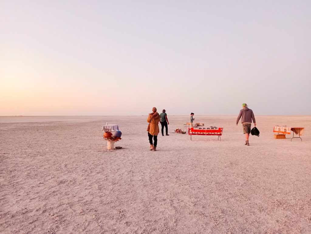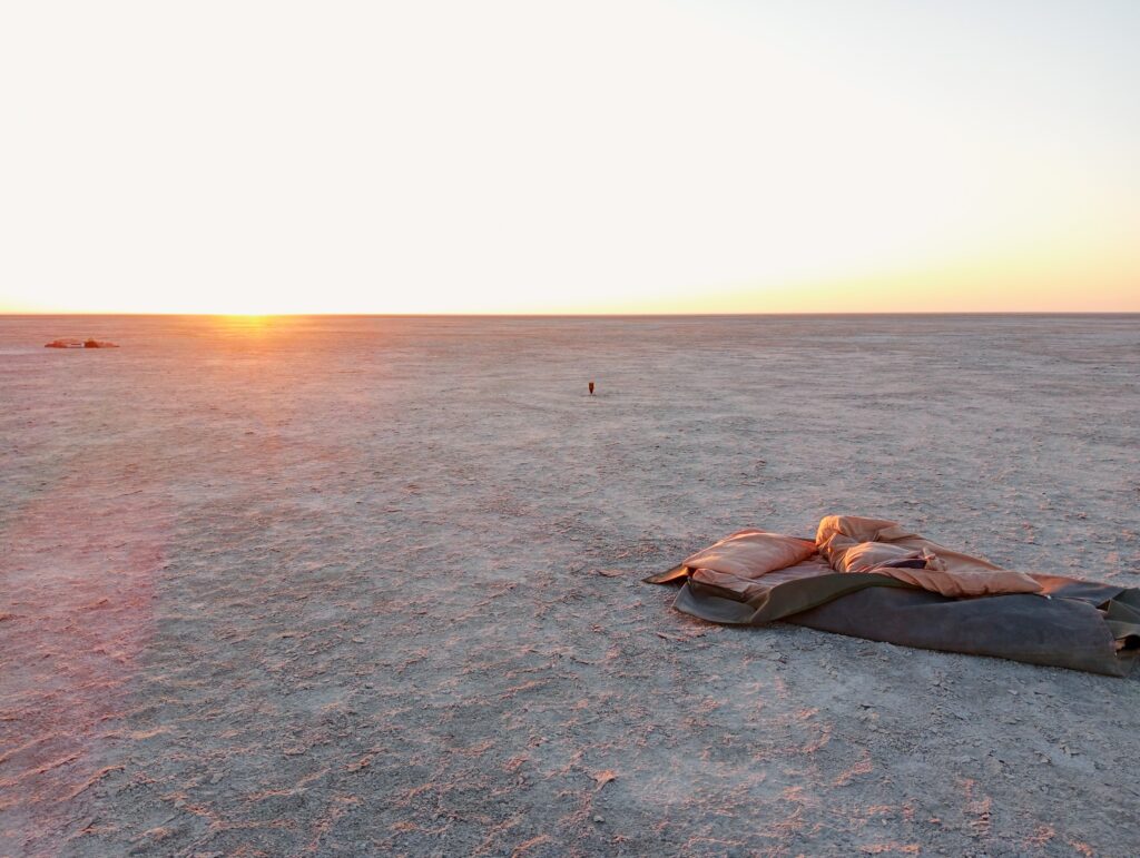 日が沈む頃、何もない塩湖のど真ん中に到着。
