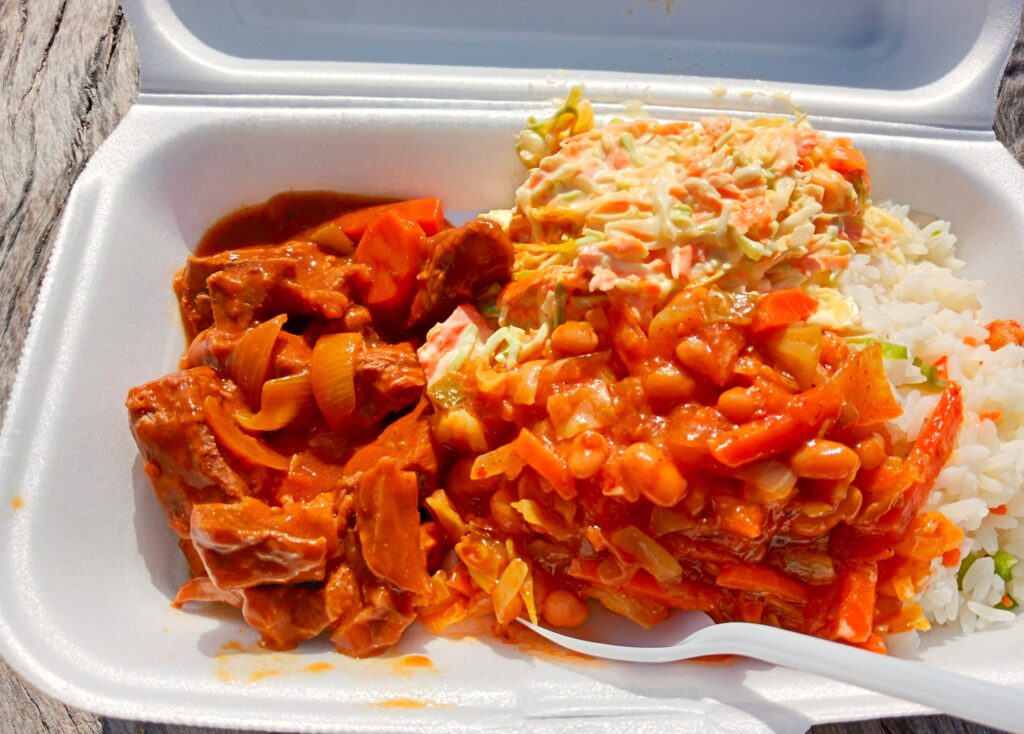 デリカッセンで買ったピラフとシチューとサラダと豆の煮物のランチボックス びっくりするほど美味しかった💕