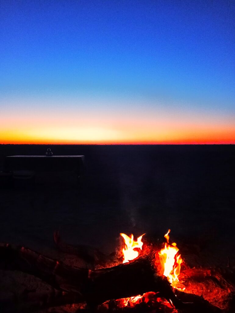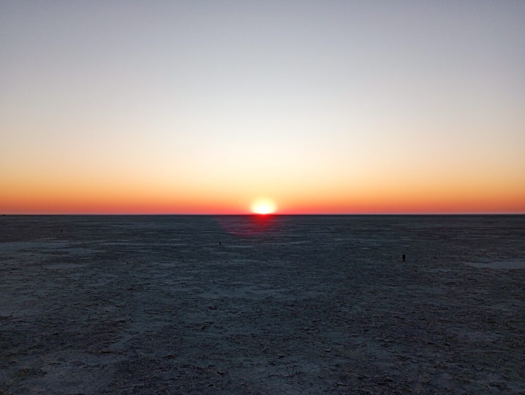 マカディカディ塩湖の夕暮れ 乾季のみ野営可能