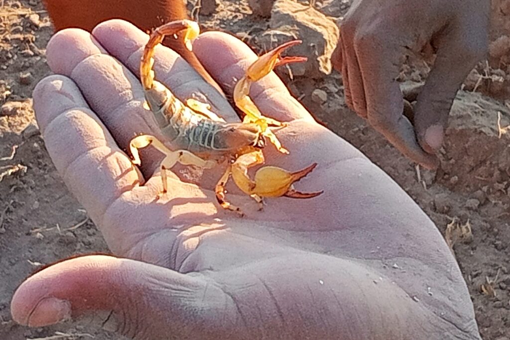 土を掘り起こしてサソリ捕獲 このサソリに毒はないとのこと