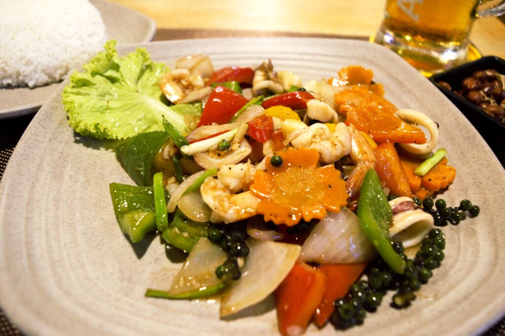 カンボジア名物イカの生胡椒炒め。シェムリアップのレストランで実食。緑の丸い海ブドウもたいなものが生胡椒👆