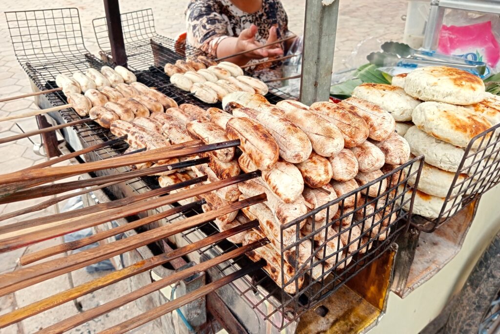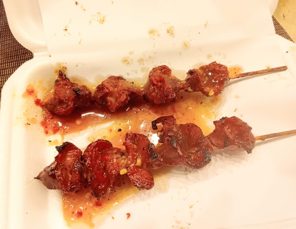 プノンペンのナイトマーケットでテイクアウトした牛肉の串焼き。