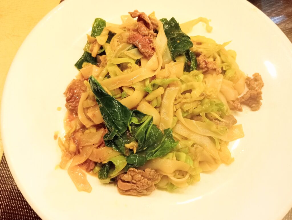 プノンペンの露店食堂で食べた平たい麺を炒めたカンボジア風焼きそば。牛肉+野菜入り。