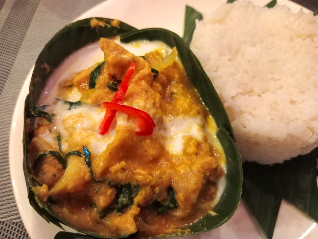 ココナッツミルクとスパイスで魚or肉を蒸した料理で、淡水魚のアモックが一般的ですが、いろいろなバージョンあり。辛味はほぼなく、マイルドで食べやすく、日本人にも食べやすいカンボジア料理です。見栄えも◎