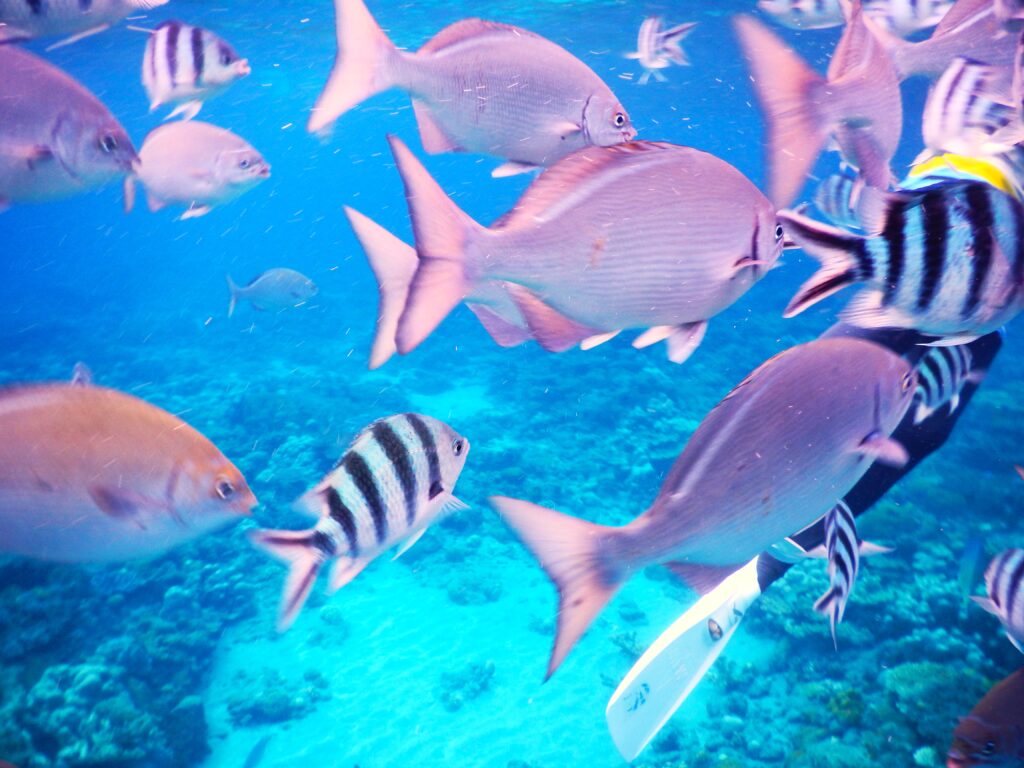 また、ドルフィンウォッチング前後のボート停泊中や父島のビーチ、港周辺でもシュノーケリングや海水浴が楽しめ、水中の透明度の高さを気軽に体感できます。