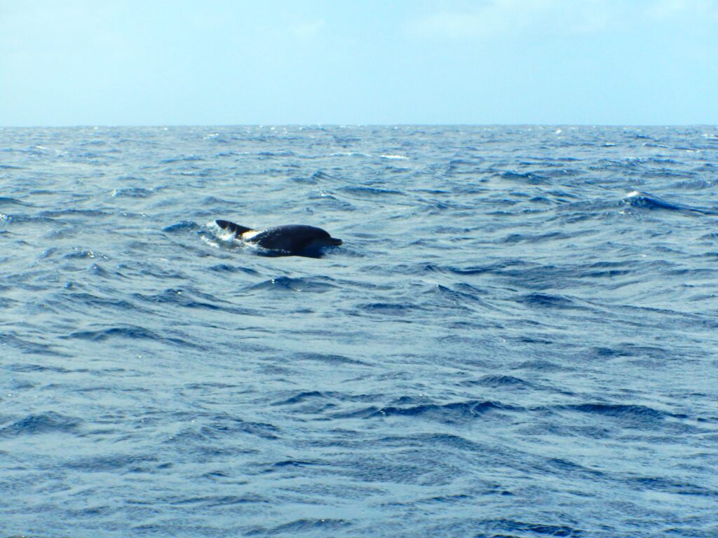 ドルフィンウォッチング中 たくさんの背びれが小さく見える