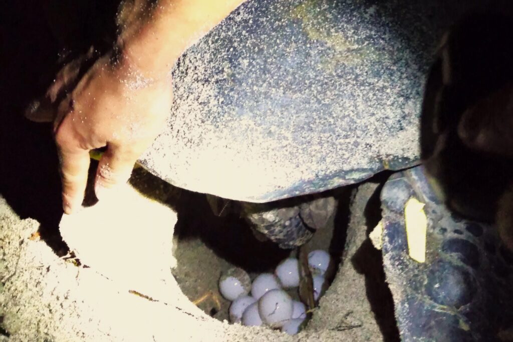 産卵中のカメ 許可を得て、ボランティア(研究員)が産卵をサポートするところを見学