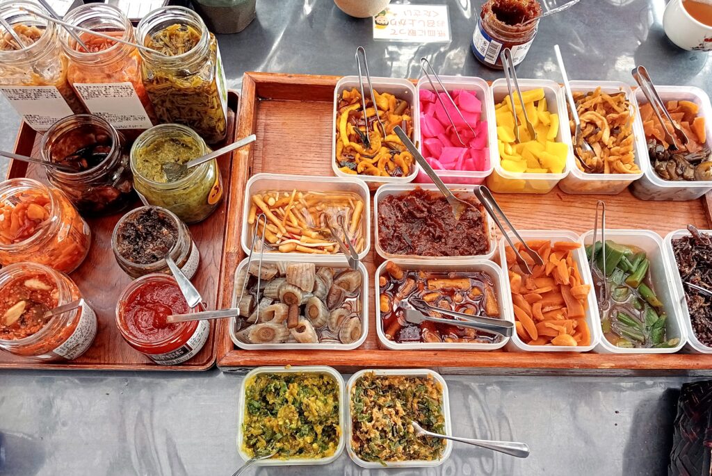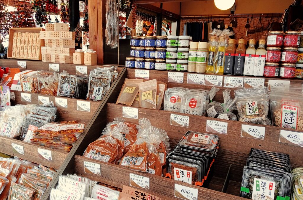 山菜などの漬物・惣菜、味噌の並ぶお土産屋さん