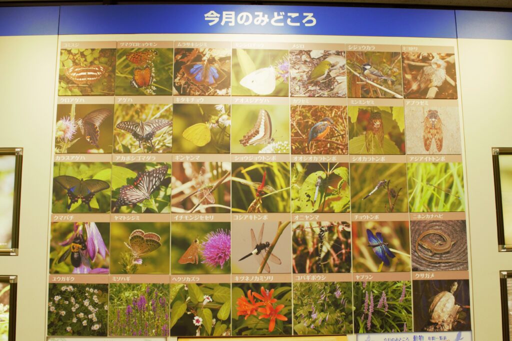 入口近くにある教育管理棟の展示ホールでは、その季節に見られる植物や生き物についての解説が展示されています。