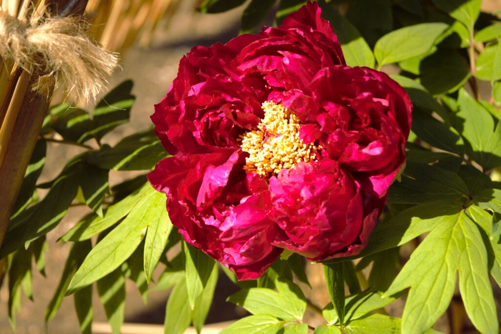 わら囲いと牡丹の組み合わせは、冬ならではのフォトジェニックな被写体です。