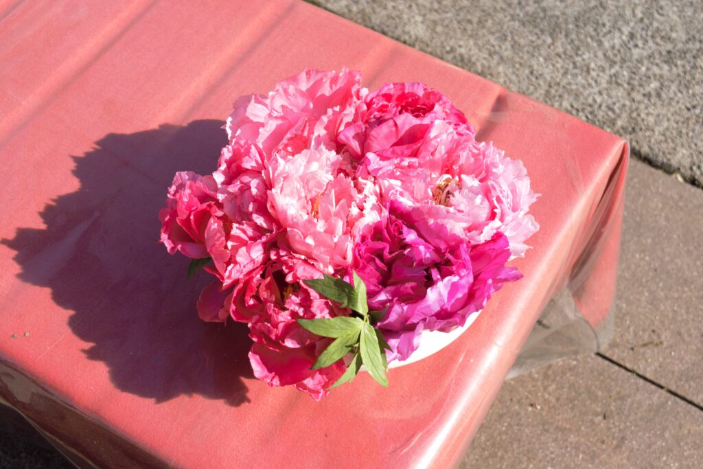 苑内に複数ある休憩場所には牡丹の生け花あり、これも美しい!